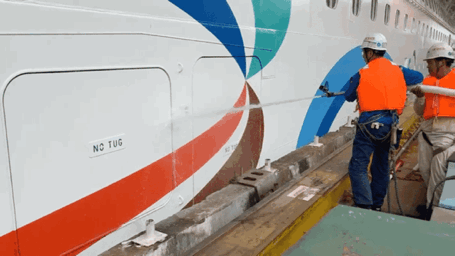 項(xiàng)目組還使用高壓水槍對(duì)舷門沖水檢驗(yàn)其密封性。大型郵輪在塢內(nèi)起浮后,船體結(jié)構(gòu)內(nèi)部應(yīng)力釋放,結(jié)構(gòu)可能產(chǎn)生細(xì)微變化,對(duì)舷側(cè)門的密性狀態(tài)帶來了一定程度的影響。“愛達(dá)·魔都號(hào)”左右舷共有42扇舷門,根據(jù)設(shè)計(jì)規(guī)范要求,對(duì)40扇舷門進(jìn)行沖水試驗(yàn)。為了保障舷側(cè)門功能完善,外高橋造船通過模擬海上航行狀態(tài),在距離舷門1.5米處,以高壓水槍沖水的方式,檢驗(yàn)了每一扇門的密封性能。
