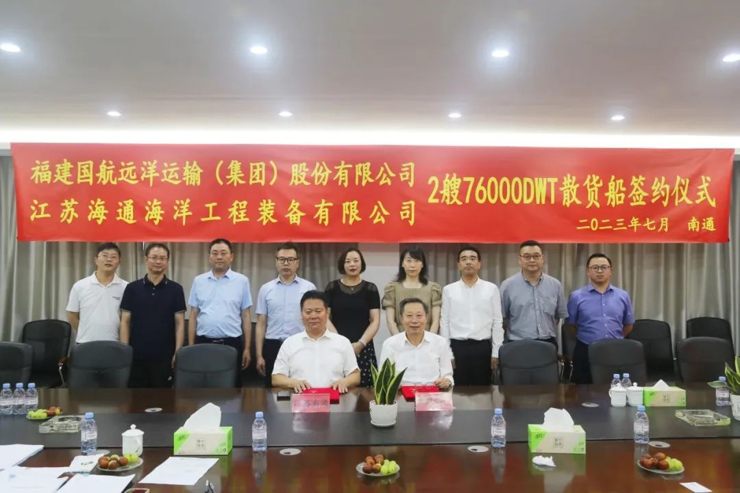 近日,福建國航遠洋運輸(集團)股份有限公司(以下簡稱“國航遠洋”)與江蘇海通海洋工程裝備有限公司(以下簡稱“江蘇海通”)在江蘇南通舉行簽訂2艘76000DWT散貨船簽約儀式,國航遠洋副總裁韓青,江蘇海通董事長金星出席該簽約儀式。