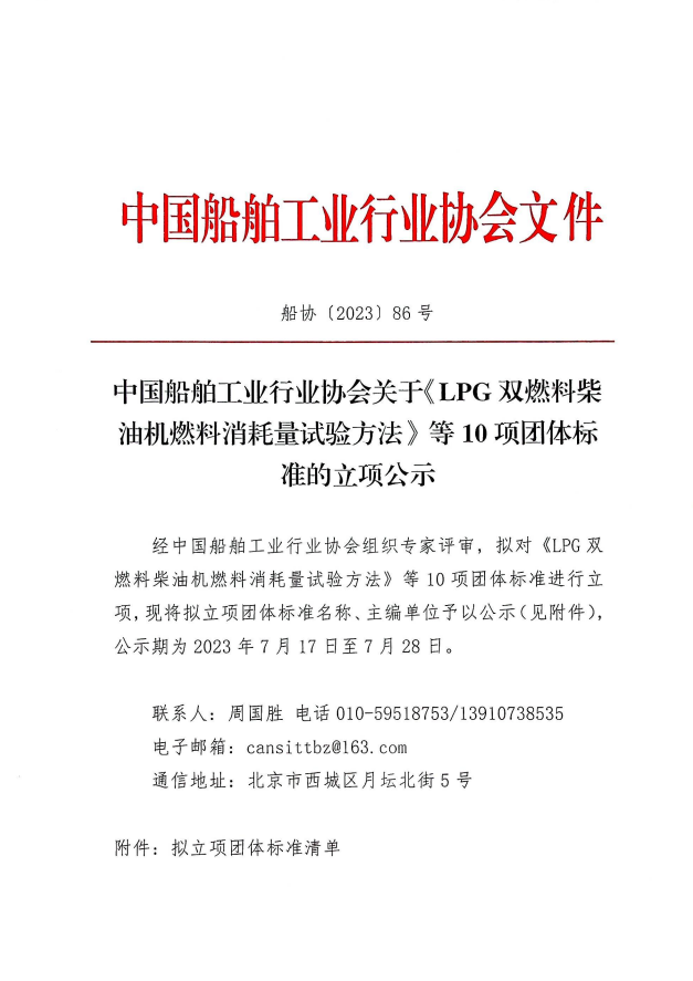 中國船舶工業(yè)行業(yè)協(xié)會關(guān)于《LPG雙燃料柴油機(jī)燃料消耗量試驗方法》等10項團(tuán)體標(biāo)準(zhǔn)的立項公示