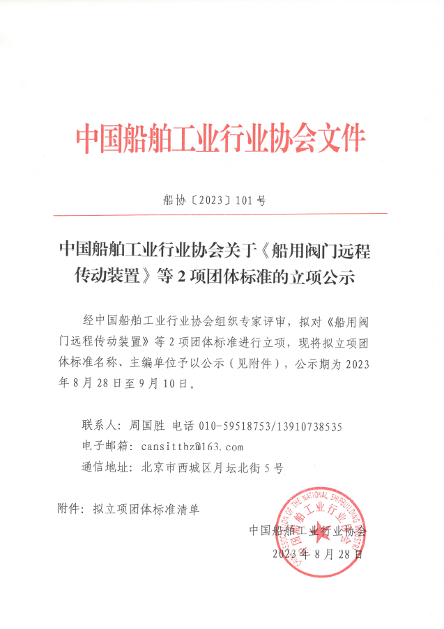中國(guó)船舶工業(yè)行業(yè)協(xié)會(huì)關(guān)于《船用閥門(mén)遠(yuǎn)程傳動(dòng)裝置》等 2 項(xiàng)團(tuán)體標(biāo)準(zhǔn)的立項(xiàng)公示