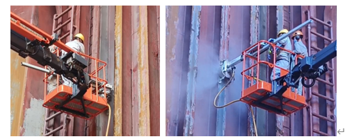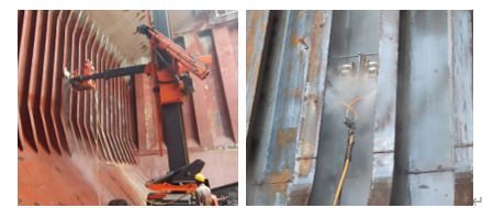 業(yè)內(nèi)人士周知,與外板的大平面除銹作業(yè)相比,散貨船貨艙內(nèi)部的結(jié)構(gòu)復雜,尤其是T型材肋骨、波型艙壁等非大平面區(qū)域的除銹作業(yè),一直是行業(yè)內(nèi)超高壓水射流除銹在貨艙內(nèi)全面應用的技術(shù)瓶頸。目前,船舶修理企業(yè)使用的除銹方法主要是采用人工手持高壓水槍除銹作業(yè)方式,存在作業(yè)效率低,除銹區(qū)域受限,除銹質(zhì)量難以達標等問題。特別在貨艙肋骨面板的反面位置,手持高壓水槍無法對這一區(qū)域進行作業(yè)。這些已成為船東和涂料服務商特別關(guān)注但又難以解決的關(guān)鍵問題。