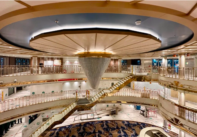 其中,艙室、餐飲等區(qū)域的內(nèi)裝工程基本接近尾聲,乘客梯道、影院劇場(chǎng)、中庭廣場(chǎng)、水上樂(lè)園、高空繩索運(yùn)動(dòng)項(xiàng)目等公共區(qū)域建成或基本建成,整體進(jìn)度達(dá)到95%。