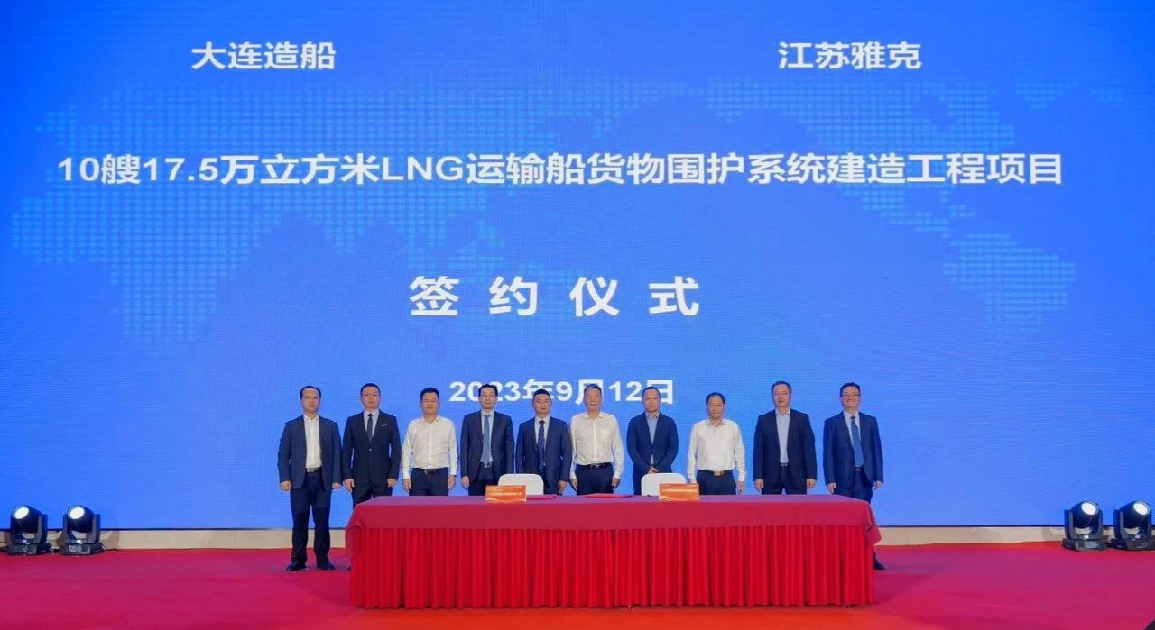 9月12日,中國船舶大連造船與江蘇雅克舉行10艘17.5萬立方米LNG運(yùn)輸船貨物圍護(hù)系統(tǒng)建造工程項(xiàng)目簽約儀式,開啟雙方戰(zhàn)略合作伙伴關(guān)系新篇章。