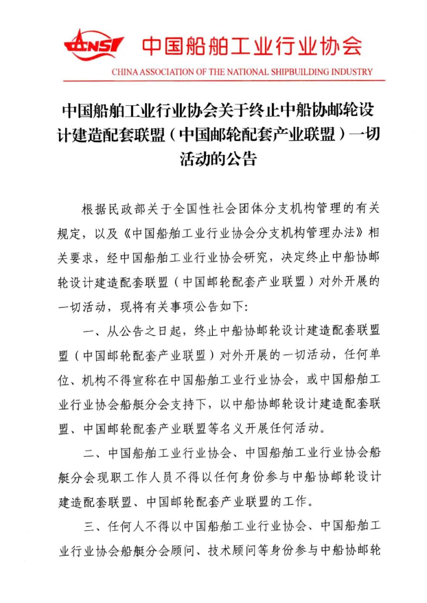 中國船舶工業(yè)行業(yè)協(xié)會關(guān)于終止中船協(xié)郵輪設(shè)計建造配套聯(lián)盟(中國郵輪配套產(chǎn)業(yè)聯(lián)盟)一切活動的公告