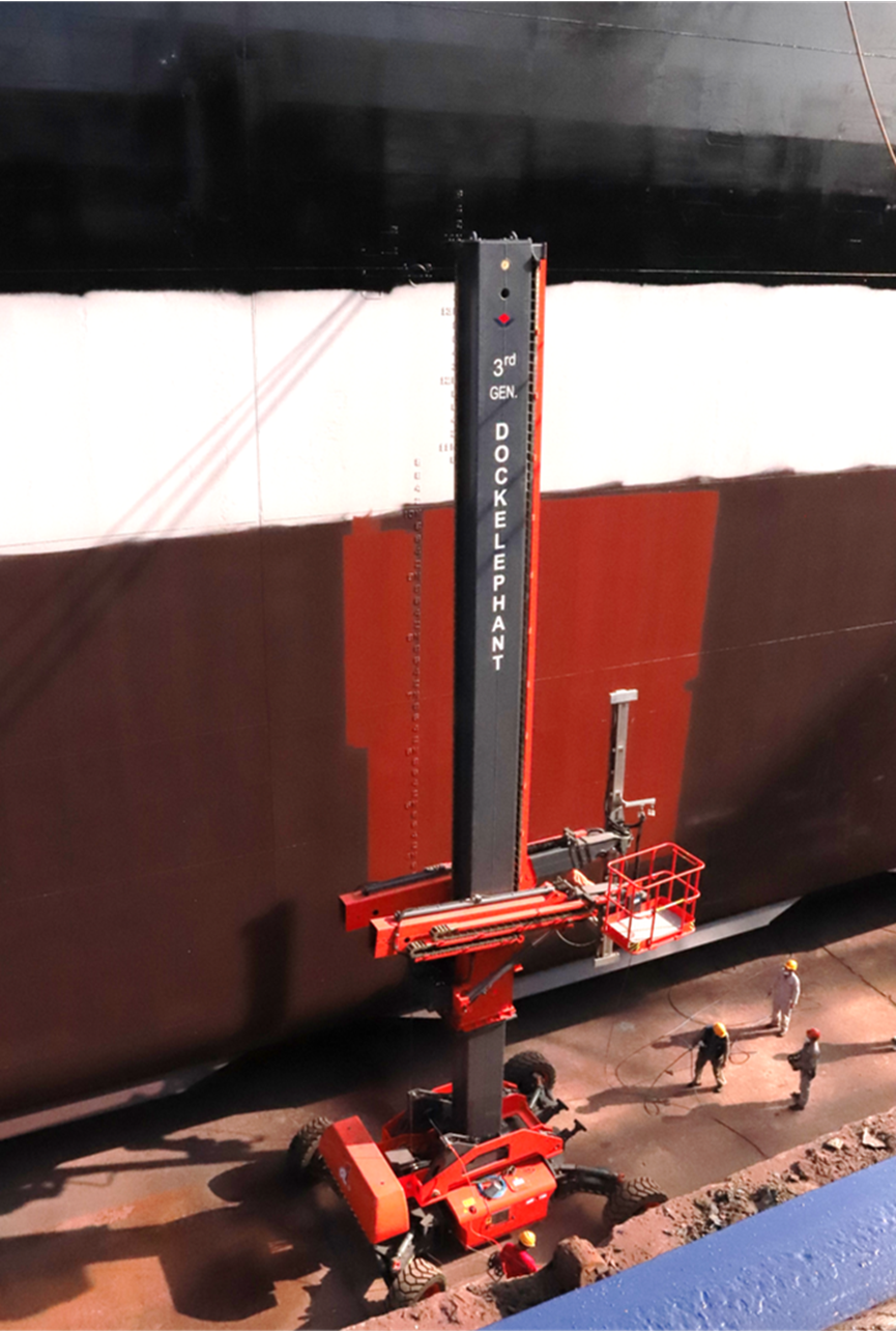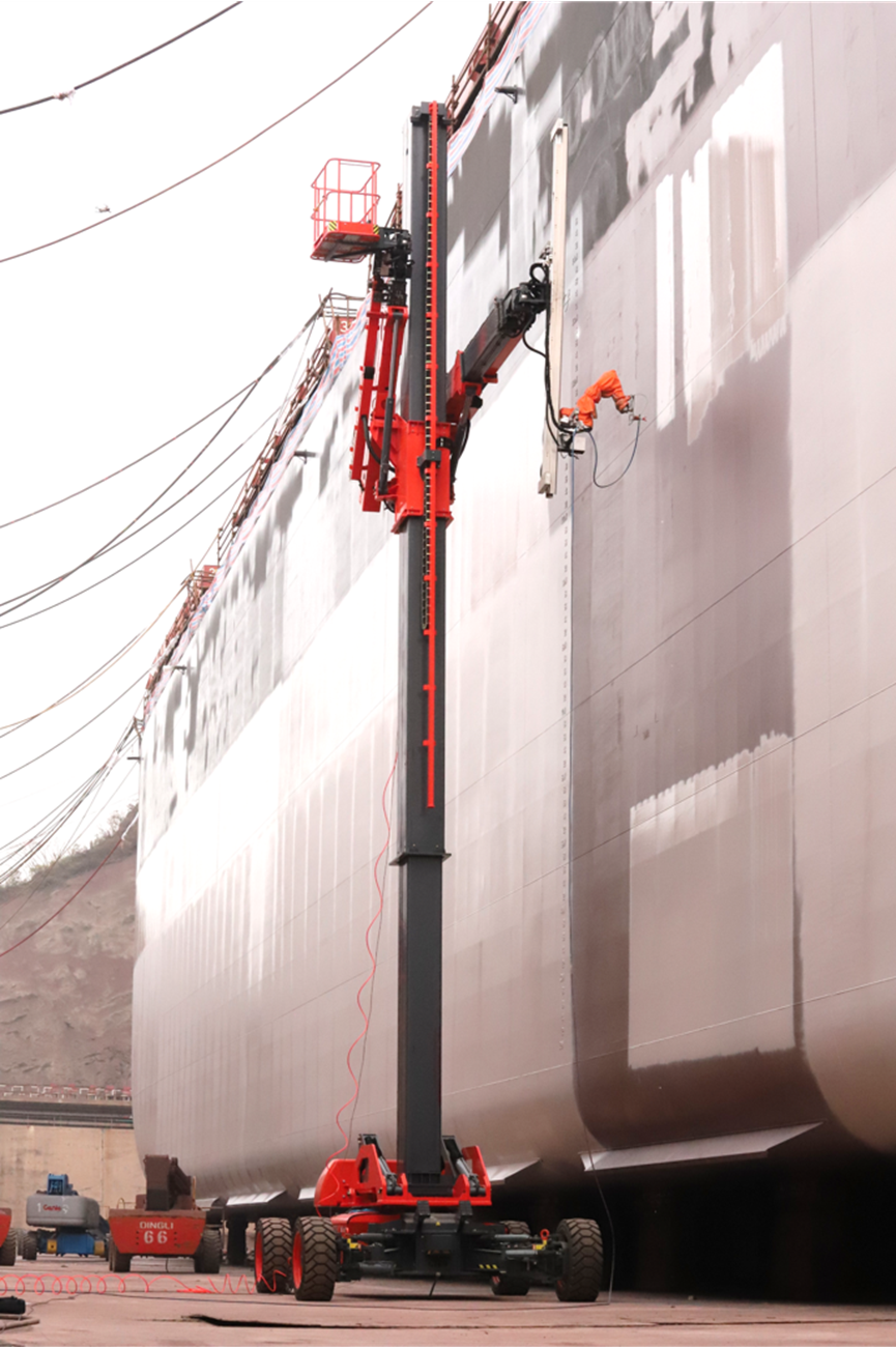 2017年,萬(wàn)邦重工成功研發(fā)、應(yīng)用并向修船行業(yè)分享真空超高壓水射流船舶防腐預(yù)處理整套解決方案。在此基礎(chǔ)上,2021年末,萬(wàn)邦重工聯(lián)合浙江鼎力,對(duì)船舶涂裝高空作業(yè)智能承載裝備(大象)和防腐噴涂機(jī)器人進(jìn)行了專(zhuān)業(yè)化、標(biāo)準(zhǔn)化以及新型智能化方面的系統(tǒng)優(yōu)化設(shè)計(jì)。在合作雙方技術(shù)研發(fā)團(tuán)隊(duì)精誠(chéng)合作下,新一代智能承載裝備和噴涂機(jī)器人產(chǎn)品取得了重大技術(shù)進(jìn)步和創(chuàng)新成果,在浙江鼎力下線進(jìn)入試用與技術(shù)完善階段,目前已具備量產(chǎn)、迭代升級(jí)和覆蓋市場(chǎng)需求的條件。