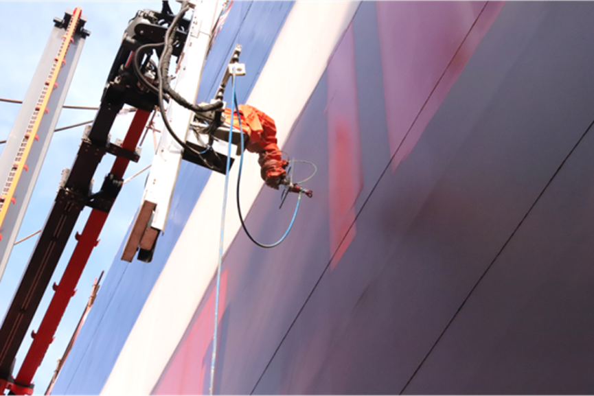 “象群”系列機(jī)器人的研制和應(yīng)用,不僅使船舶外殼噴涂作業(yè)模式和作業(yè)品質(zhì)發(fā)生了本質(zhì)的改變,更重要的是大幅度降低了傳統(tǒng)噴涂作業(yè)過(guò)程中涂料飛散入大氣環(huán)境中的損耗。應(yīng)用數(shù)據(jù)顯示,涂料使用量較傳統(tǒng)人工噴涂可節(jié)省近20%以上,相應(yīng)可減少VOCs排放量以及碳排放量近20%以上,減少了涂料消耗成本及對(duì)環(huán)境的污染。同時(shí),智能?chē)娡繖C(jī)器人作業(yè)可大幅降低作業(yè)人員勞動(dòng)強(qiáng)度,施工品質(zhì)不受作業(yè)人員技能的制約;作業(yè)后涂層膜厚均勻,可增強(qiáng)涂層附著力約30%,延長(zhǎng)了涂層保護(hù)周期;增強(qiáng)了涂層表面光潔度,降低了涂層表面粗糙度約25%,降低了船舶航行阻力,可有效減少船舶燃油消耗,不僅為船東節(jié)省了船舶運(yùn)營(yíng)成本,同時(shí)也減少了碳排放量。