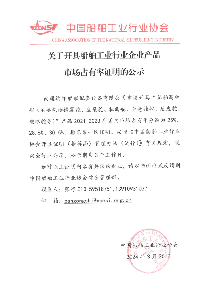 關(guān)于開具船舶工業(yè)行業(yè)企業(yè)產(chǎn)品市場占有率證明的公示
