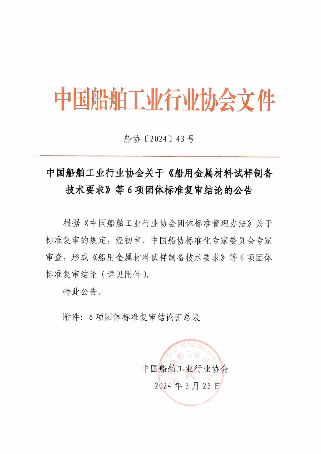 中國(guó)船舶工業(yè)行業(yè)協(xié)會(huì)關(guān)于《船用金屬材料試樣制備技術(shù)要求》等6項(xiàng)團(tuán)體標(biāo)準(zhǔn)復(fù)審結(jié)論的公告