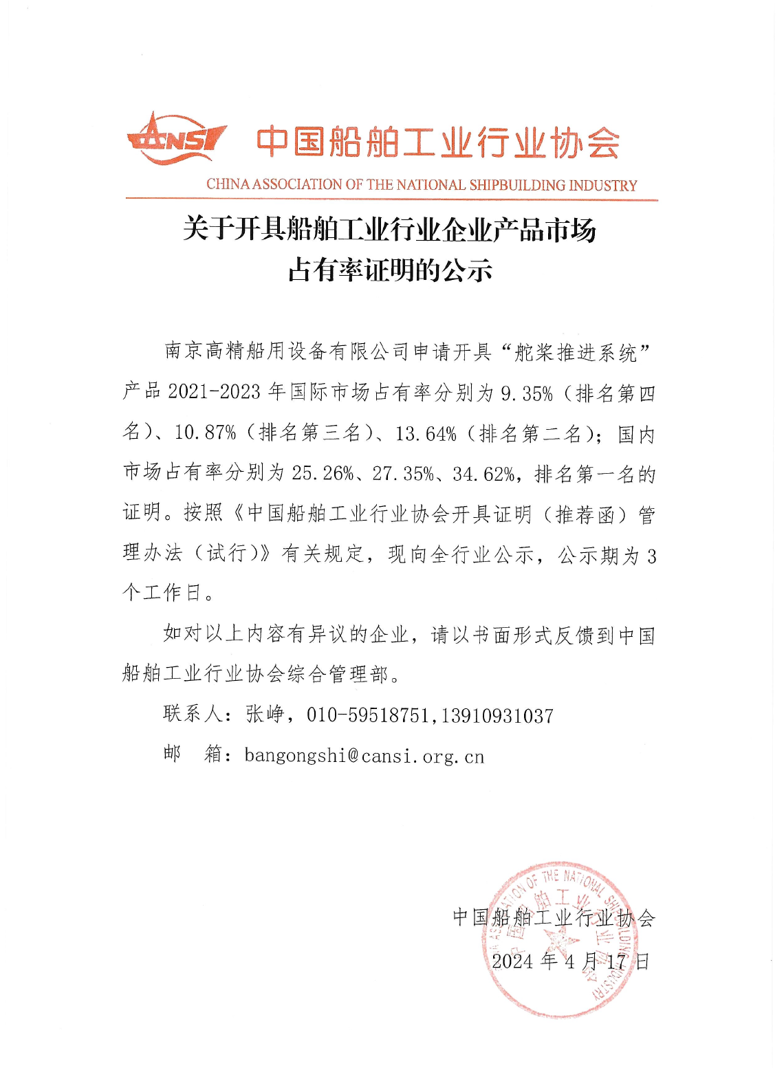 關(guān)于開具船舶工業(yè)行業(yè)企業(yè)產(chǎn)品市場(chǎng)占有率證明的公示