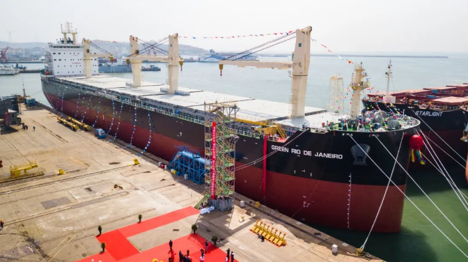 4月18日,大連中遠(yuǎn)海運(yùn)重工為交銀金租建造的系列77000噸多用途紙漿船 “GREEN RIO DE JANEIRO”輪舉行交付命名儀式。該輪是大連中遠(yuǎn)海運(yùn)重工建造的第四艘77000噸多用途紙漿船。