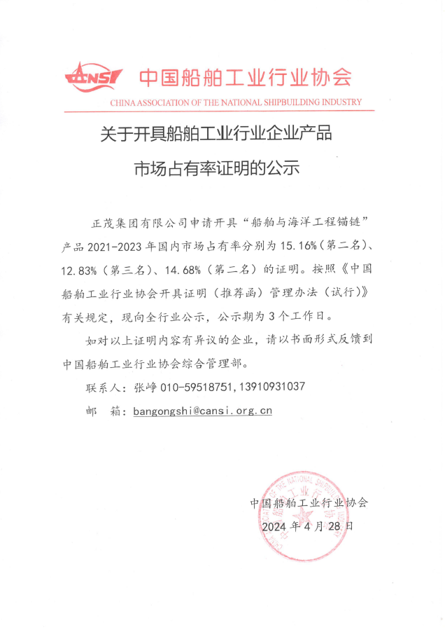 關(guān)于開具船舶工業(yè)行業(yè)企業(yè)產(chǎn)品市場占有率證明的公示
