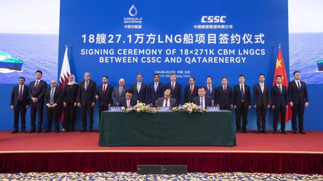 4月29日,中國船舶集團有限公司與卡塔爾能源在京舉行18艘全球最大27.1萬立方米超大型液化天然氣(LNG)運輸船項目簽約儀式。工業(yè)和信息化部副部長單忠德,外交部西亞北非司大使呂健,中國船舶集團董事長溫剛、副總經(jīng)理盛紀綱,卡塔爾能源事務國務大臣、卡塔爾能源總裁兼首席執(zhí)行官薩阿德·謝里達·阿爾卡比,卡塔爾能源天然氣首席執(zhí)行官卡利德·阿爾-塞尼,卡塔爾能源商務和業(yè)務發(fā)展執(zhí)行副總裁賈西姆·阿爾馬拉祖齊等領導和嘉賓出席簽約儀式。