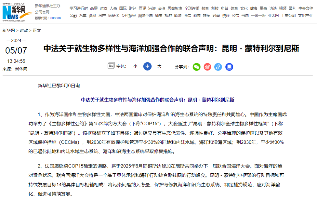 根據(jù)新華社5月7日正式發(fā)布的《中法關(guān)于就生物多樣性與海洋加強(qiáng)合作的聯(lián)合聲明:昆明-蒙特利爾到尼斯》(簡稱聯(lián)合聲明),中法兩國將在國際海事組織(IMO)框架下,通過全球協(xié)調(diào)的政策,共同做出努力,并研究技術(shù)和市場舉措,推進(jìn)航運(yùn)業(yè)溫室氣體減排工作,增強(qiáng)可持續(xù)替代能源競爭力;并加強(qiáng)在藍(lán)色經(jīng)濟(jì)領(lǐng)域以及可持續(xù)沿海旅游等方面的合作。