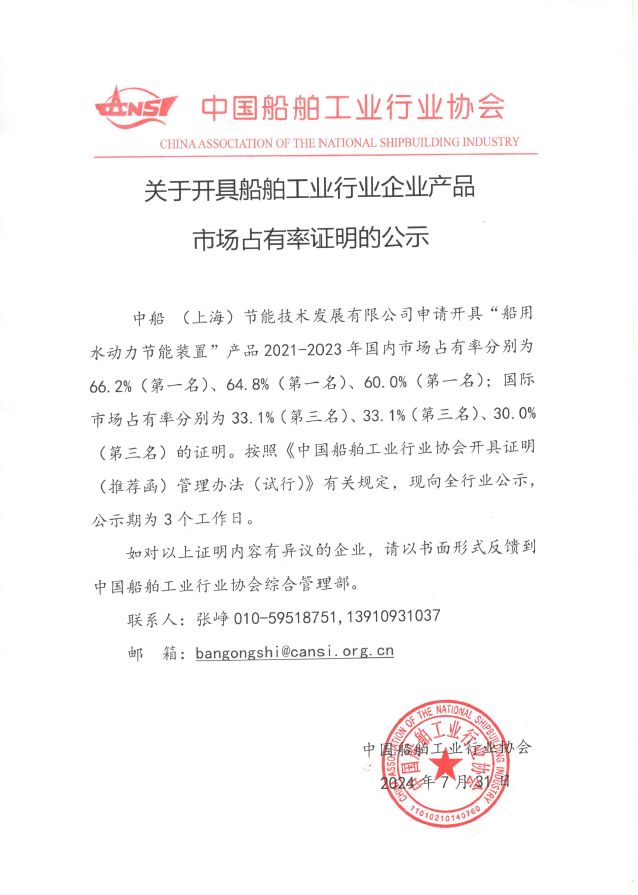 關(guān)于開具船舶工業(yè)行業(yè)企業(yè)產(chǎn)品市場占有率證明的公示