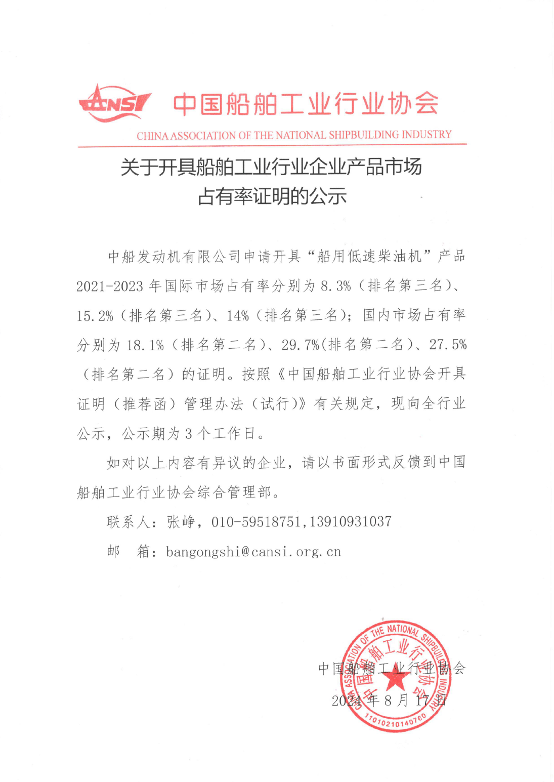 關(guān)于開具船舶工業(yè)行業(yè)企業(yè)產(chǎn)品市場(chǎng)占有率證明的公示