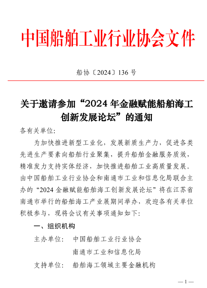 關(guān)于邀請(qǐng)參加“2024年金融賦能船舶海工創(chuàng)新發(fā)展論壇”的通知