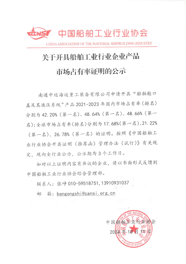 關(guān)于開具船舶工業(yè)行業(yè)企業(yè)產(chǎn)品市場占有率證明的公示
