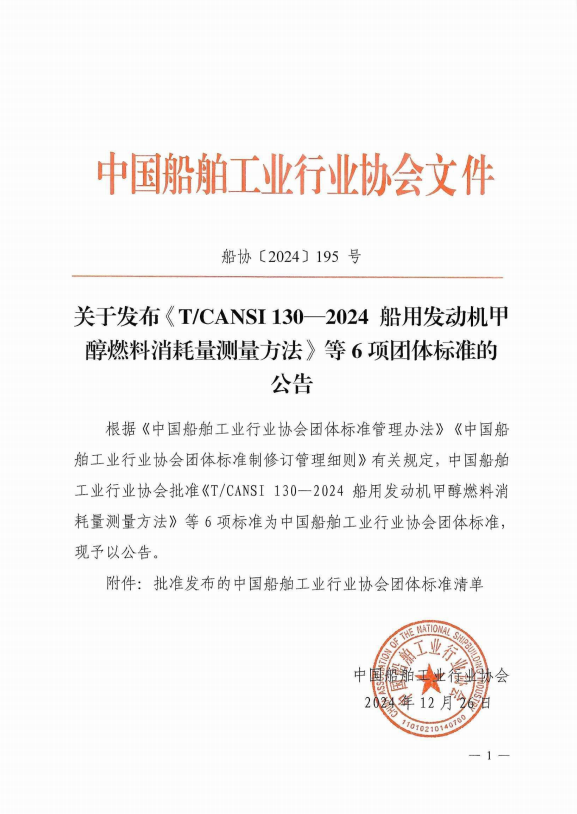 關(guān)于發(fā)布《T/CANSI130-2024船用發(fā)動機(jī)甲醇燃料消耗量測量方法》等6項(xiàng)團(tuán)體標(biāo)準(zhǔn)的公告