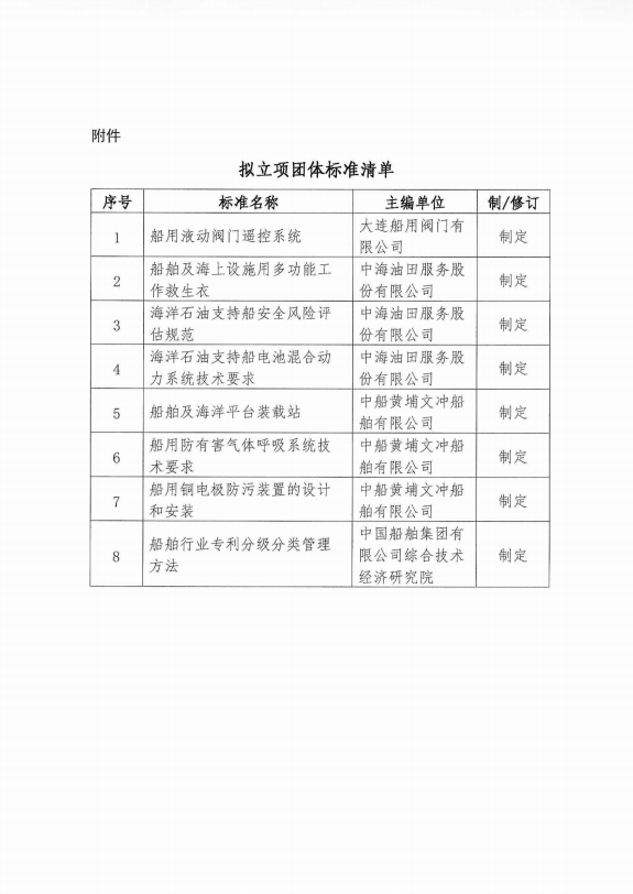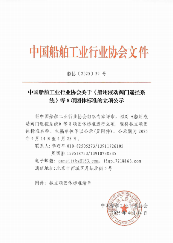 中國船舶工業(yè)行業(yè)協(xié)會關于《船用液動閥門遙控系統(tǒng)》等8項團體標準的立項公示