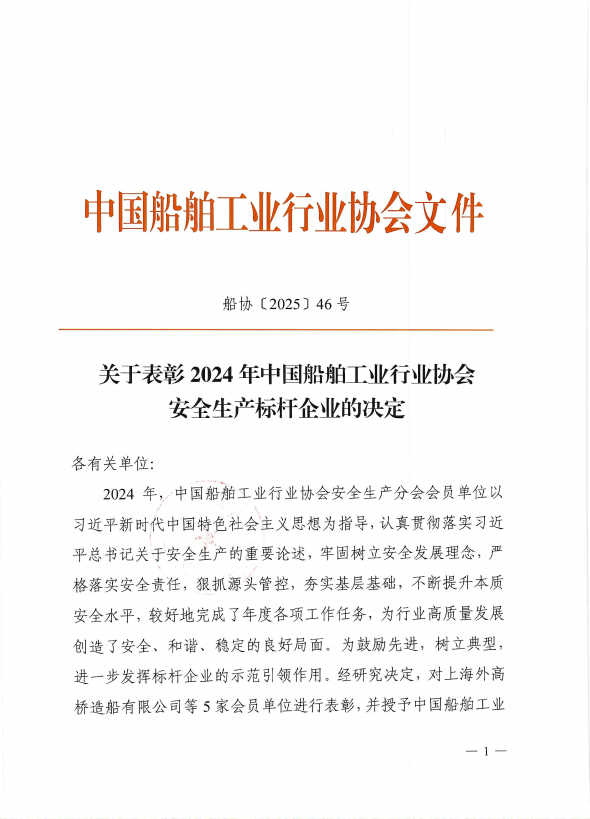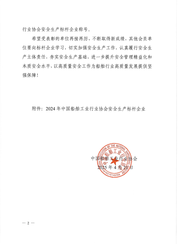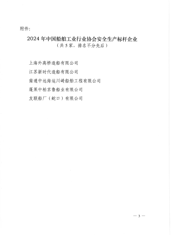 關(guān)于表彰2024年中國船舶工業(yè)行業(yè)協(xié)會安全生產(chǎn)標(biāo)桿企業(yè)的決定