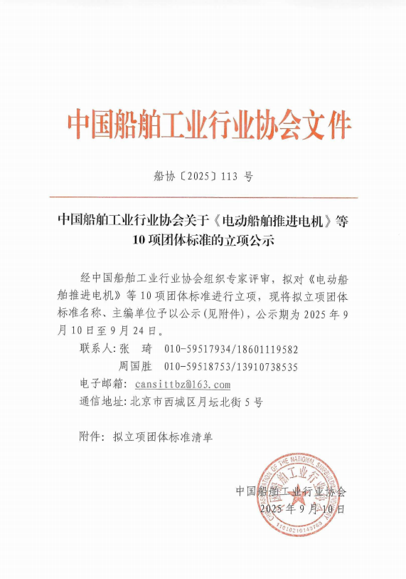 中國(guó)船舶工業(yè)行業(yè)協(xié)會(huì)關(guān)于《電動(dòng)船舶推進(jìn)電機(jī)》等10項(xiàng)團(tuán)體標(biāo)準(zhǔn)的立項(xiàng)公示