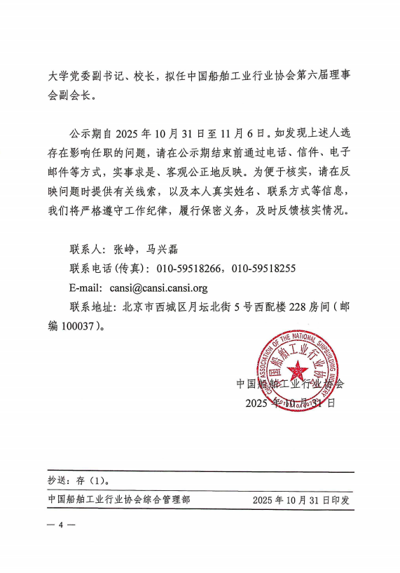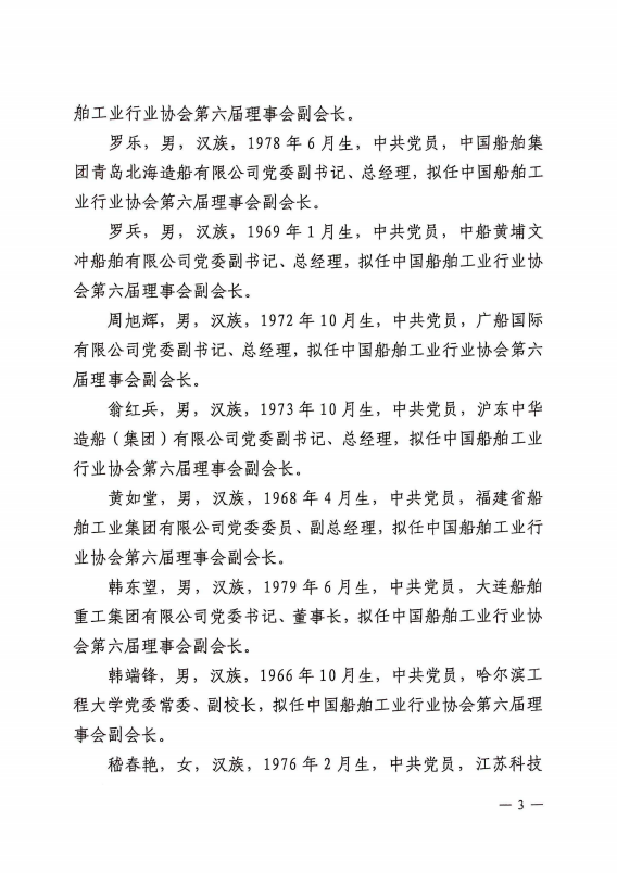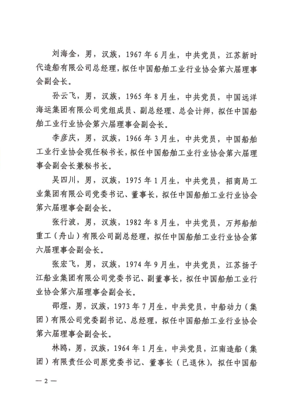 關(guān)于中國船舶工業(yè)行業(yè)協(xié)會第六屆理事會負(fù)責(zé)人人選的公示