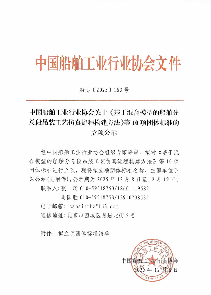 中國(guó)船舶工業(yè)行業(yè)協(xié)會(huì)關(guān)于《基于混合模型的船舶分總段吊裝工藝仿真流程構(gòu)建方法》等10項(xiàng)團(tuán)體標(biāo)準(zhǔn)的立項(xiàng)公示